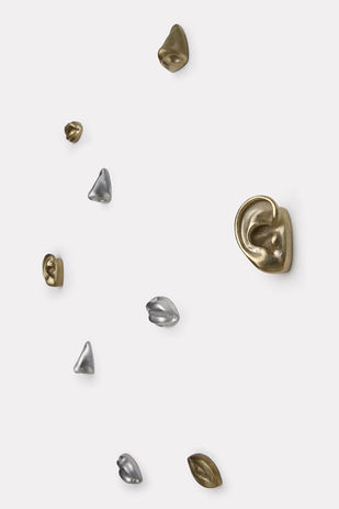 No centro, uma cabeça estilizada, desprovida de olhos, boca, nariz e orelhas, transforma-se em luminária, emitindo luz e silêncio. Os sentidos, separados do rosto, ganham autonomia ao se tornarem esculturas de parede. Essa ausência inquietante materializa o vazio como um convite à introspecção. A coleção Sentidos em Suspenso convida à pausa e à reflexão dentro do caos cotidiano. Em meio ao excesso de informação que nos atravessa diariamente e sem descanso, torna-se urgente criar brechas de silêncio para que a mente possa respirar. É nesse intervalo que conseguimos absorver a realidade, reconhecer nossos limites e seguir vivendo com respeito por nós mesmos. O que constitui o ser humano? Somos nossos sentidos? Ou somos aquilo que sentimos? Todas as peças da coleção são produzidas em latão (dourado) ou alumínio (prateado), através do processo de fundição artesanal de metais.
